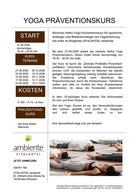 Ein weiterer Hatha Yoga Präventionskurs für sportliche Anfänger und Wiedereinsteiger mit Yogaerfahrung startet am 27.08.2026. Der Kurs findet immer donnerstags von 18.45-20.00 Uhr statt.